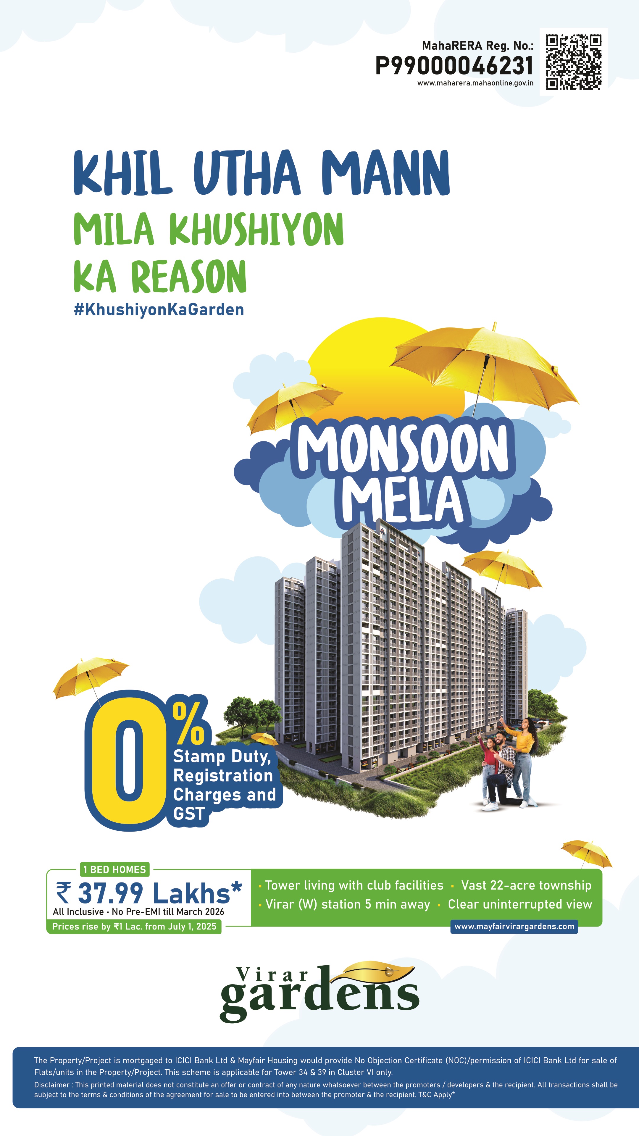 Mayfair Total Homes Virar West Project will be constructed on 22 acres of land parcel, 7 towers with G+22 floors having 1 BHK premium residences. Mayfair Plus Homes located Near Bolinj Naka, Virar West, Mumbai with Old Viva College - 1.9km, Virar Railway Station - 2 km, D Mart - 2.4km. Mayfair The Promenade Virar West Project Internal amenities likes of Vetrified Tiles, Granite Kitchen, Modular Kitchen, Earthquake Resistance, Kitchen Platform, SS...Sink, Powder Coated Aluminium Sliding Windows, Video door phone, Gas leak detector, Smoke detector, Biometric lock & many more. Mayfair Housing Virar West External Amenities project has 30+ amenities with likes of Club House, Multipurpose Hall, Multisport Court, Indoor games, Gymnasium & Many More. Mayfair Housing The Promenade Virar West project has Ground Level of car parking facility. Mayfair The Promenade Rera Possession - December 2028 and Target Possession - December 2025. The Promenade project has 1 BHK and 2 BHK premium residences with 1 BHK - (393 to 440) sqft and 2 BHK - 590 sqft. Mayfair The Promenade tower floor plan will have 4 flats 2 lifts & 2 staircases on each floor. Mayfair The Promenade Mumbai Project maintenance varies with the configuration and the carpet area which are as follows 1 BHK - Rs (1600 to 1800) per month and 2 BHK - Rs 2200 per month. The Promenade Virar West project sample flat is ready to view at the site. The Promenade Prices & its details can be found in the price section & Mayfair The Promenade Virar West brochure can be downloaded from the link mentioned below. Project has been praised by the home buyers & Mayfair Housing Virar West review is 4 out of 5 from over all the clients who have visited the site.